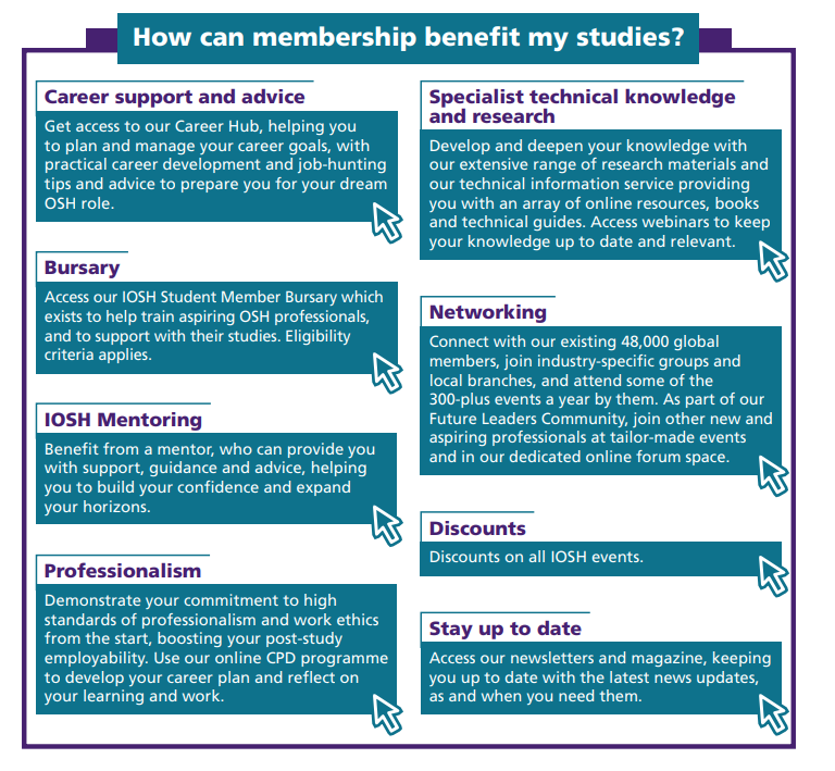 Being a member of IOSH opens a world of professional opportunities to safety and health that will support progress at work and contribute tangibly to business success. It will also enable access a multitude of benefits, including IOSH Blueprint and CPD. At the start of the IOSH Level 6 Diploma learners will need to join us a Student Member if they are not already a member and meet the eligibility criteria. Eligible enrolled students can access IOSH Student Membership for the duration of their studies and, on successful completion, they will meet the academic requirements for Graduate/Certified IOSH membership.