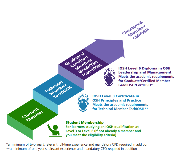 This qualification enables learners to progress within their career as an OSH professional and is a recognised qualification for entry at Graduate/ Certified IOSH Member (GradIOSH/CertIOSH) grade (subject to meeting experiential criteria). It can also provide opportunities to progress in leadership and management qualifications.
